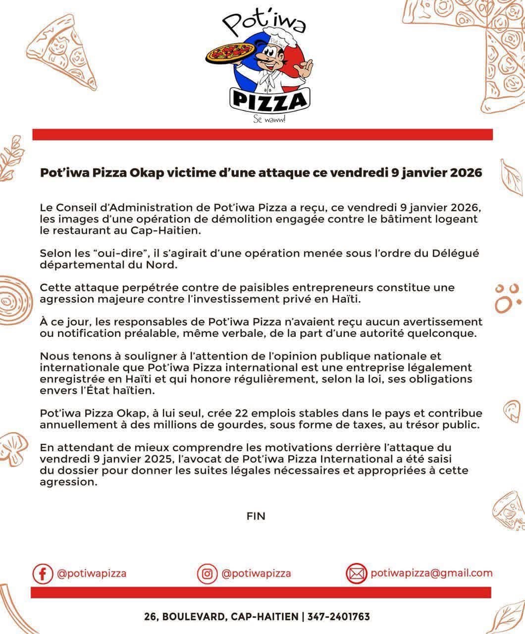 Le vendredi 9 janvier 2026, un bâtiment abritant le restaurant Potiwa Pizza Okap a été la cible d’une opération de démolition menée dans des conditions pour le moins troublantes. Selon une note officielle publiée par le Conseil d’administration de l’entreprise, cette action s’est déroulée sans avertissement préalable, sans notification formelle et sans qu’aucune autorité n’ait jugé nécessaire d’engager un dialogue avec les responsables de l’établissement.