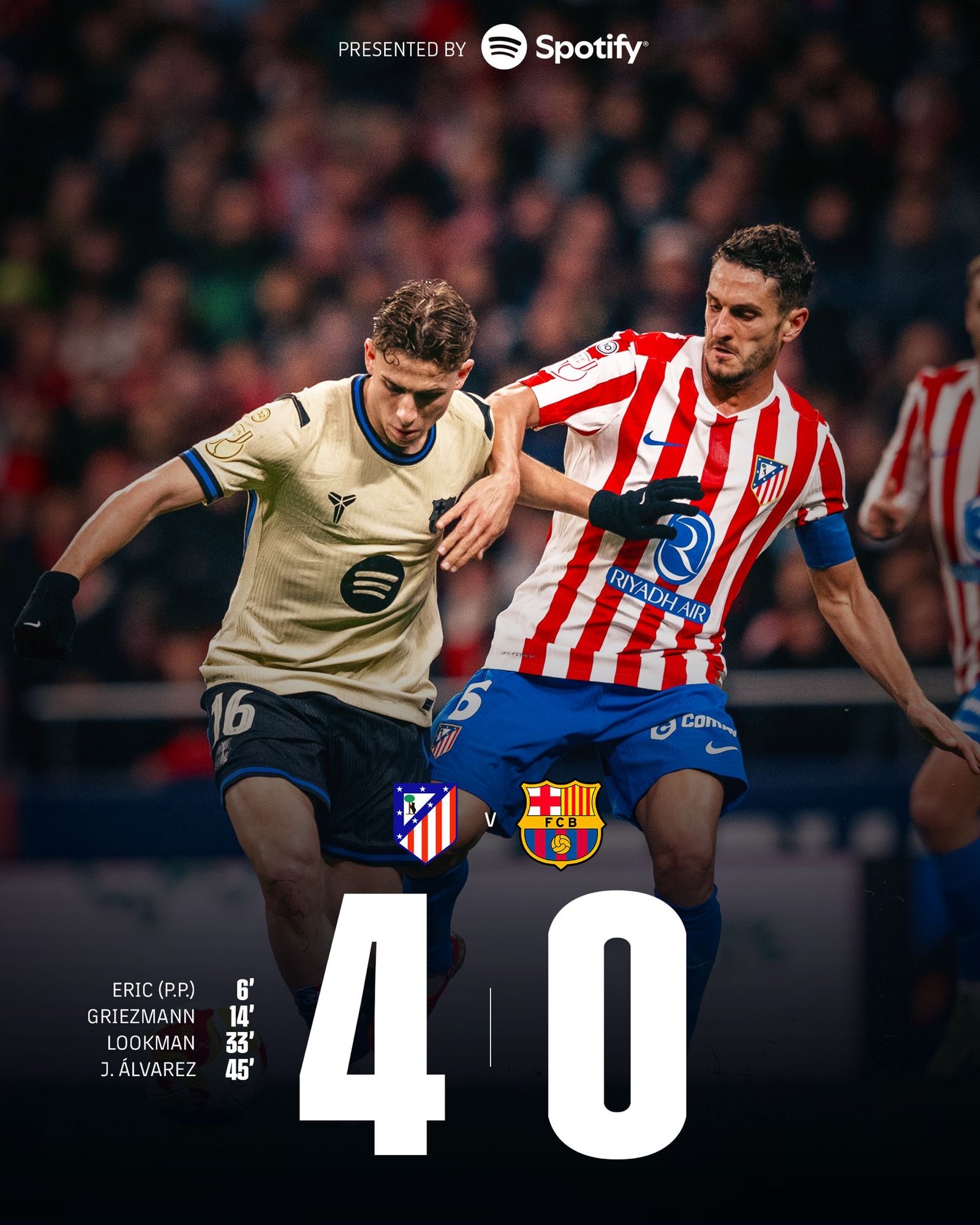 Dès la 6e minute, Eric García a marqué contre son camp, mettant les Catalans en difficulté. Antoine Griezmann a doublé la mise à la 14e minute grâce à un placement parfait. Ademola Lookman a ensuite aggravé le score à la 33e minute, profitant d’une défense dépassée. Juste avant la pause, Julián Álvarez a inscrit le quatrième but à la 45e minute, scellant une première période à sens unique.